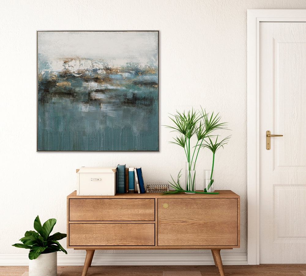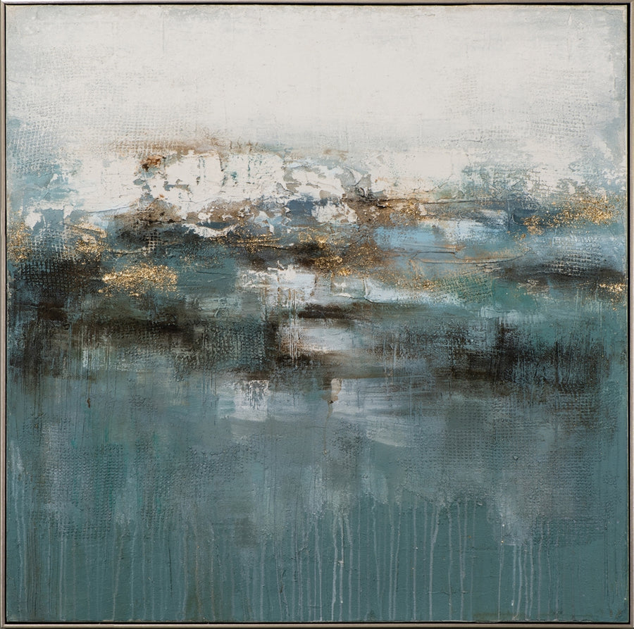 Ein kunstfertiges visuelles Gleichgewicht zwischen Intensität und Ruhe. Professionelle Strukturtechnik unterstrichen durch Craquelé und lichtreflektierenden Akzenten aus goldener Metallfolie stehen im dynamischen Kontrast zu harmonischen blaugrünen Passagen. Ein wirkungsvoll handgemaltes Acryl Gemälde gekonnt abgerundet durch einen silbernen Schattenfugenrahmen. Begeistern Sie mit Kunstverstand Ihre Gäste oder Ihre Kunden.