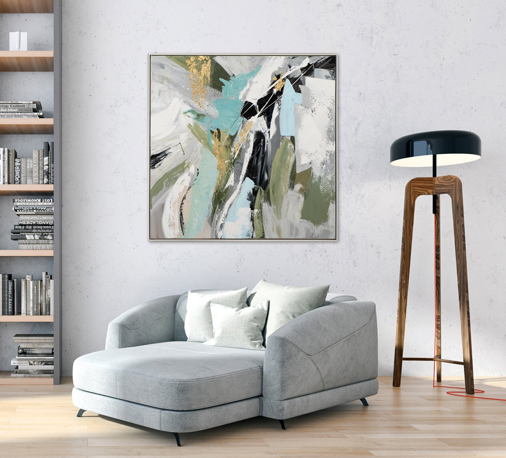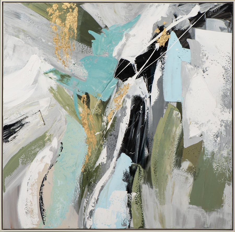 Eine besondere Farbkomposition bringt dieses Gemälde in den Farben Hellblau und Oliv in Ihr Zuhause! Ein modernes Bild der Spachteltechnik mit goldfarbenen Akzenten aus Metallfolie, die effektvolle Lichtreflexe setzen. Ein abwechslungsreiches Gemälde für jeden Raum!