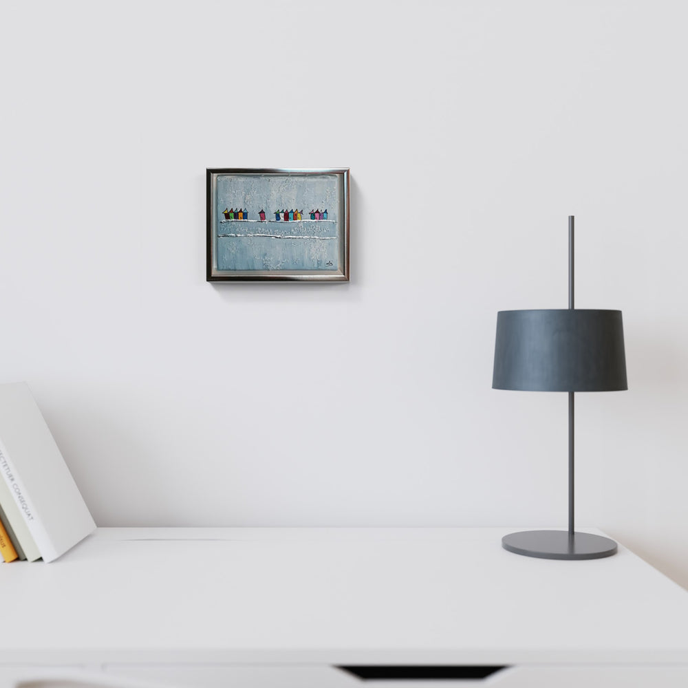 Dieses Werk zeigt farbenfrohe Häuser inmitten einer leuchtenden Berglandschaft. Wie alle Bilder von Lea Bach hat diese Acrylmalerei viel Struktur, durch die verwendete Spachteltechnik erweckt es den Eindruck von Tiefe und zieht den Betrachter in seinen Bann.