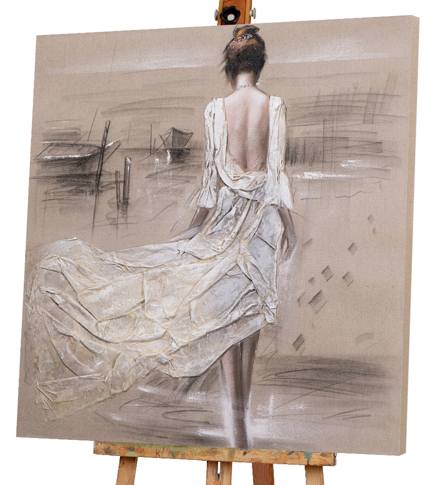 Das besondere hier ist das textile Kleid aus Naturleinen. So entsteht der realistische Eindruck einer Dame im hellen, luftigen Sommerkleid, das im Wind weht. Der Effekt Glitter verleiht dem gesamten Werk einen strahlenden Glanz. Die hellen Pastelltöne erscheinen verspielt und sorgen in jedem Raum für eine Wohlfühlatmosphäre.