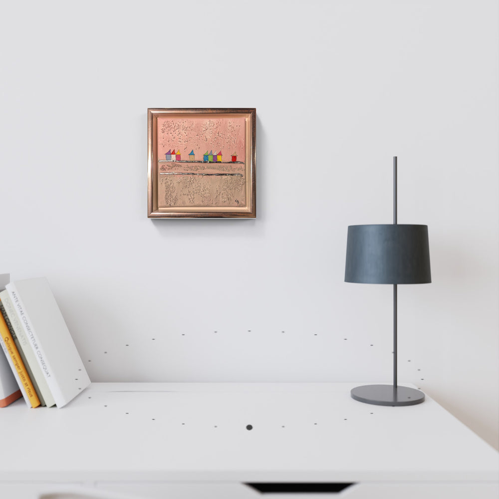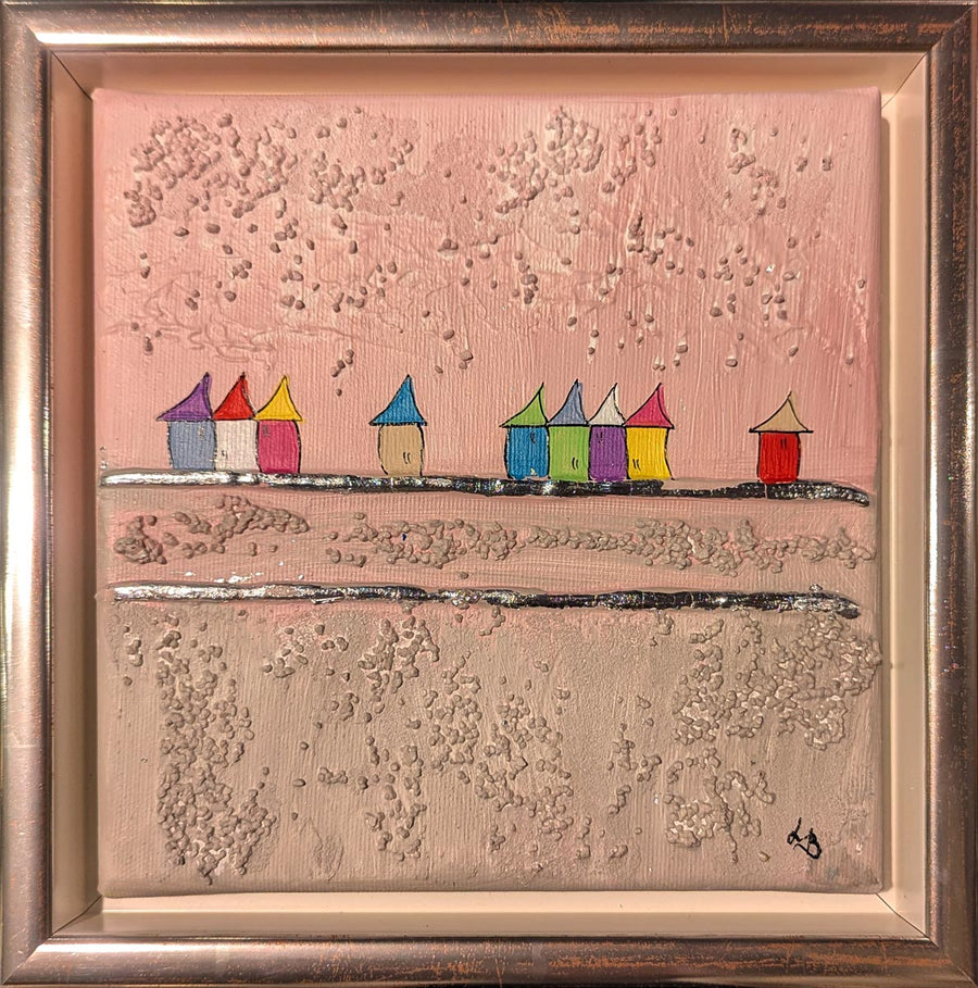 Dieses Werk zeigt farbenfrohe Häuser inmitten einer leuchtenden Berglandschaft. Wie alle Bilder von Lea Bach hat diese Acrylmalerei viel Struktur, durch die verwendete Spachteltechnik erweckt es den Eindruck von Tiefe und zieht den Betrachter in seinen Bann.