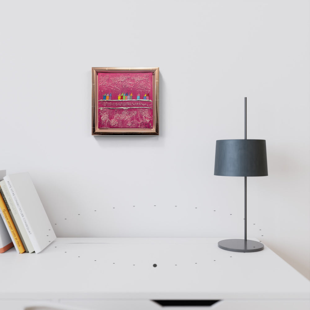 Dieses Werk zeigt farbenfrohe Häuser inmitten einer leuchtenden Berglandschaft. Wie alle Bilder von Lea Bach hat diese Acrylmalerei viel Struktur, durch die verwendete Spachteltechnik erweckt es den Eindruck von Tiefe und zieht den Betrachter in seinen Bann.
