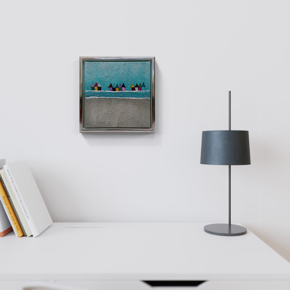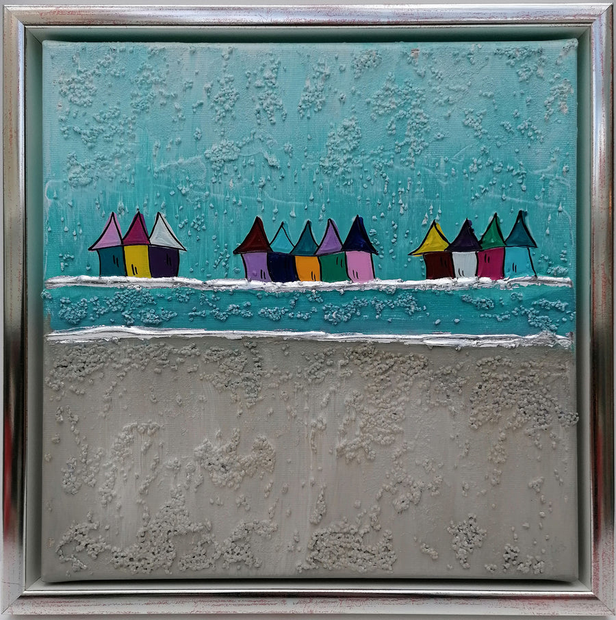 Dieses Werk zeigt farbenfrohe Häuser inmitten einer leuchtenden Berglandschaft. Wie alle Bilder von Lea Bach hat diese Acrylmalerei viel Struktur, durch die verwendete Spachteltechnik erweckt es den Eindruck von Tiefe und zieht den Betrachter in seinen Bann.