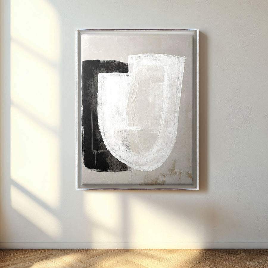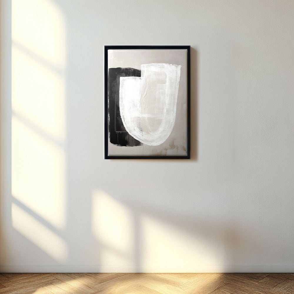 Das abstrakte Kunstwerk „Origins(Ursprünge) untersucht die Eigenart von Form und Kontrast. Eine weiße, geschwungene Gestalt überlagert einen kantigen, dunklen Hintergrund, als ob sie sich aus ihm herauslöst – ein Symbol für Entstehung und Transformation. Die Verwendung von nur Schwarz, Weiß und Grautönen lenkt den Blick umso mehr auf Struktur, Bewegung und Materialität.