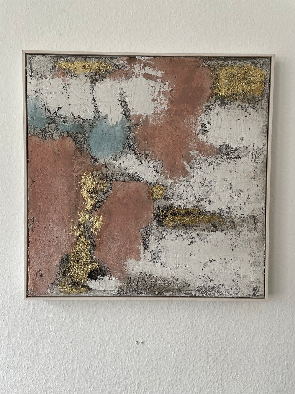 Dieses 70x70cm große Gemälde bietet abstrakte Impressionen in Rosa und Gold, die durch goldene Akzente und eine Strukturmalerei mit Acrylfarben verstärkt werden. Mit einem eleganten Holzrahmen setzt es einen luxuriösen Akzent in jedem Raum. Perfekt für Kunstliebhaber und Interieur Enthusiasten.