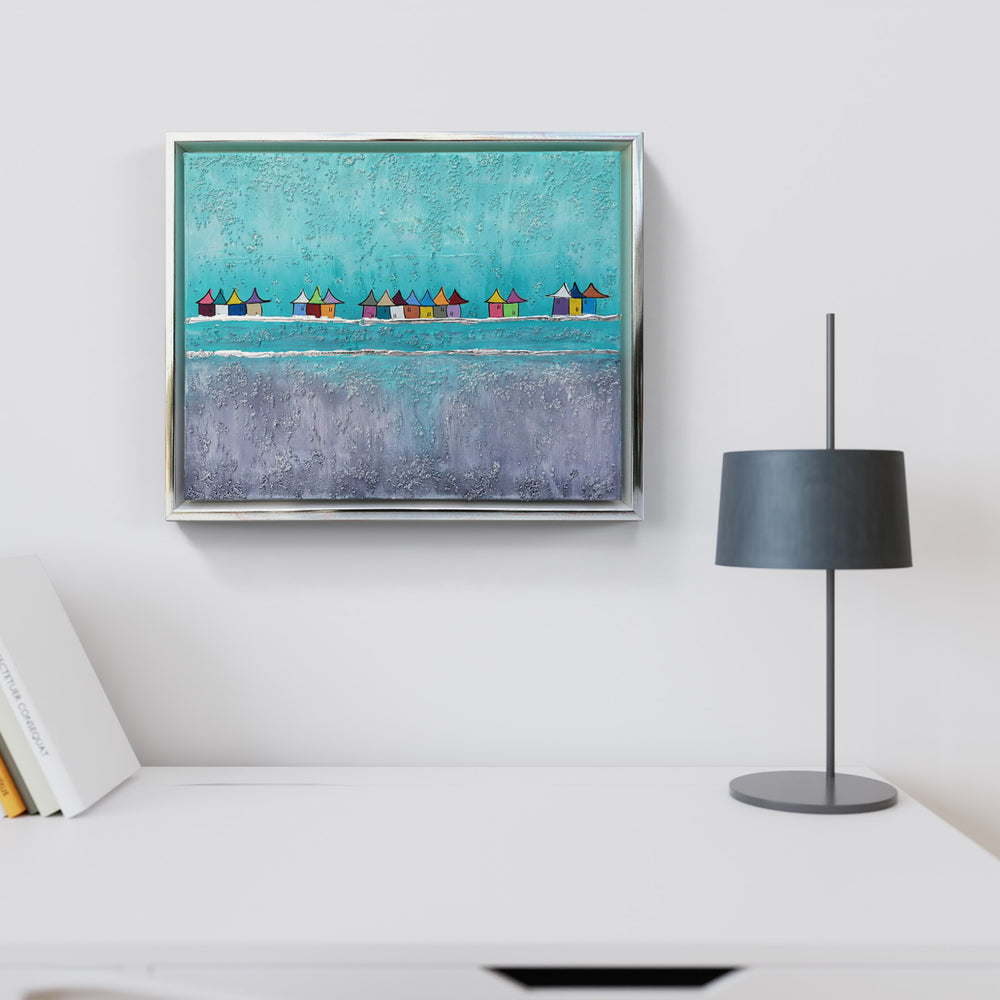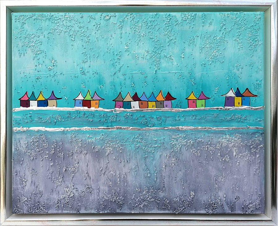 Dieses Werk zeigt farbenfrohe Häuser inmitten einer leuchtenden Berglandschaft. Wie alle Bilder von Lea Bach hat diese Acrylmalerei viel Struktur, durch die verwendete Spachteltechnik erweckt es den Eindruck von Tiefe und zieht den Betrachter in seinen Bann.