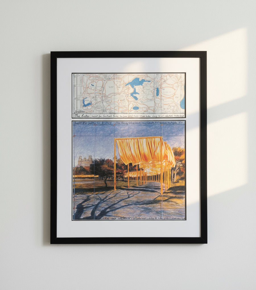 Dieser fins-art Kunstdruck von Christo "The Gates III" wird auf hochwertigem gehämmertem Karton gedruckt und bietet mit seinem schwarzem Maßrahmen und dem doppelten Passepartout einen edlen Look. Das Museumsglas schützt das Kunstwerk vor Schmutz und UV-Strahlen.