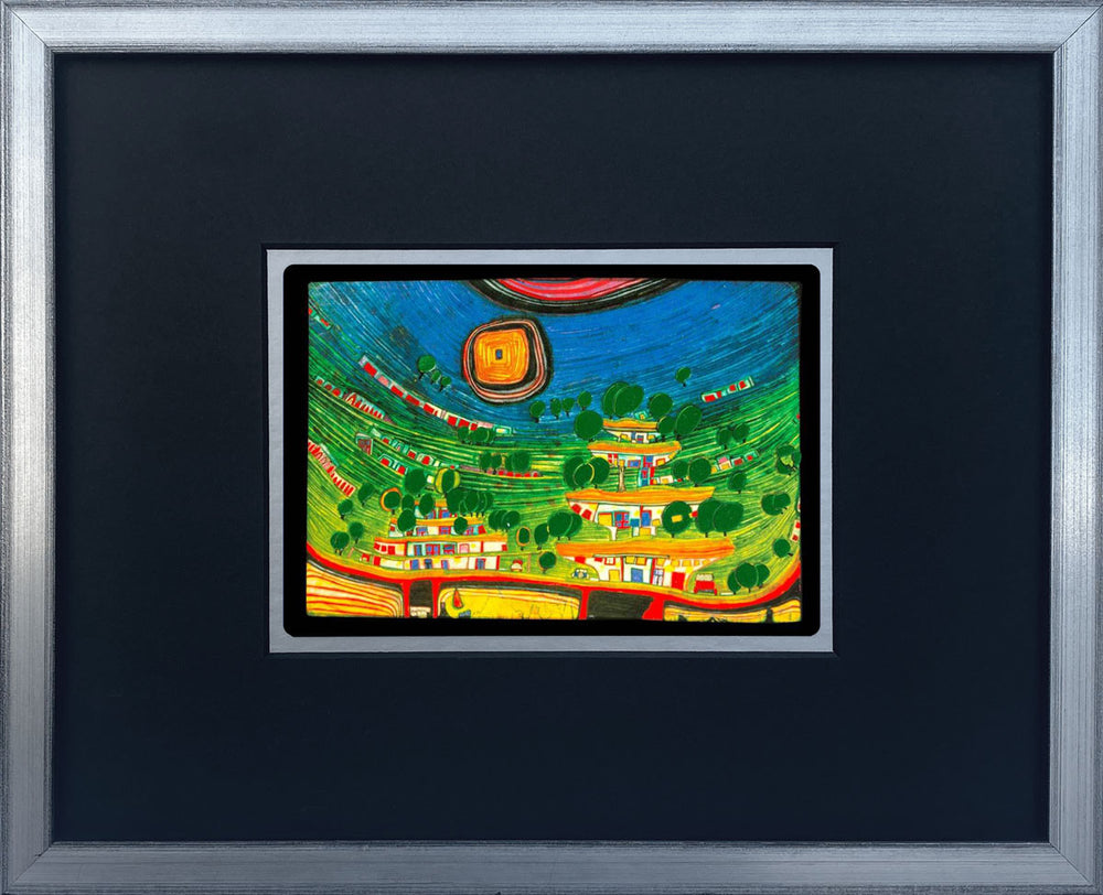 "Die Häuser hängen an der unterseite der Wiesen" | Friedensreich Hundertwasser Miniprint mit Rahmen ist gewöhnlich in 1 - 5 Werktagen Versandbereit