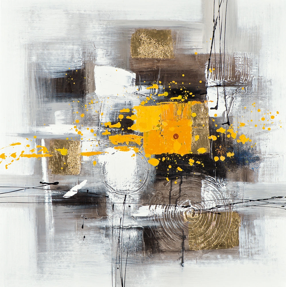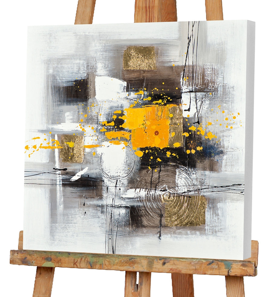 Kunstfertig handgemalte abstrakte Geometrie in schönen Erdtönen veredelt durch tolle Strukturtechnik. Goldakzente aus Metallfolie setzen schimmernde Effekte. Erfrischend zentriertes Gelb überzeugt. Beindrucken Sie Ihre Gäste daheim oder in Ihren Geschäftsräumen.