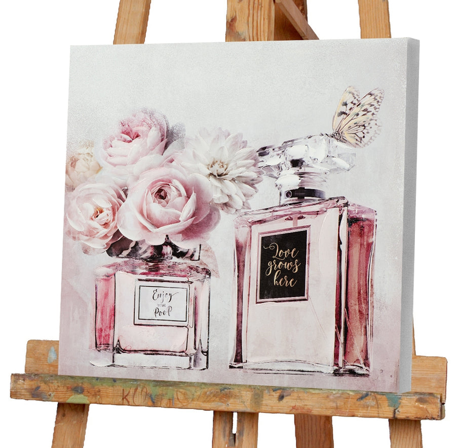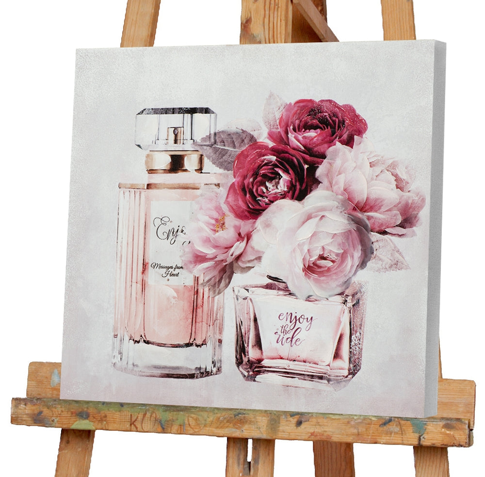 Ein Blickfang für alle Rosen und Parfum Liebhaber! Mit zauberhaften Rosen in hellen Rosa Farbtönen bringt dieses Werk viel Liebe und Fröhlichkeit in Ihr Zuhause. Für einen schimmernden Glanz sorgt die Veredelung mit Metallfolie, die effektvolle Lichtreflexe setzt!