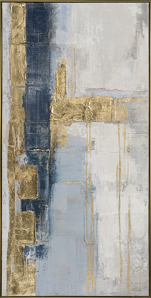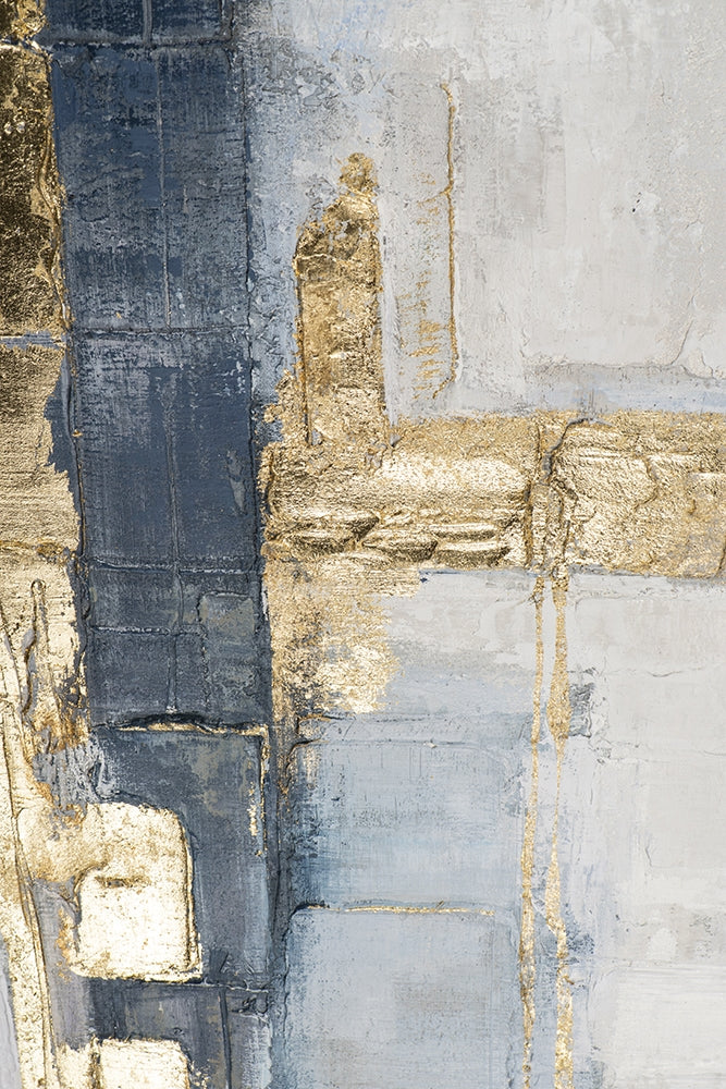 Diese Komposition ist eine Ode an den Minimalismus und die Eleganz der Moderne. In einem Zusammenspiel aus satten Blautönen, cremigen Weißflächen und luxuriösen Goldakzenten lädt dieses abstrakte Kunstwerk dazu ein, die Vielfalt der Formen und Texturen zu erkunden. Die Textur wirkt reich und vielschichtig, was dem Betrachter Raum für eigene Interpretationen und Emotionen bietet. Ideal für moderne Innenräume, kann dieses Stück als zentrales Designelement dienen, das Eleganz und zeitgenössische Kunst vereint.