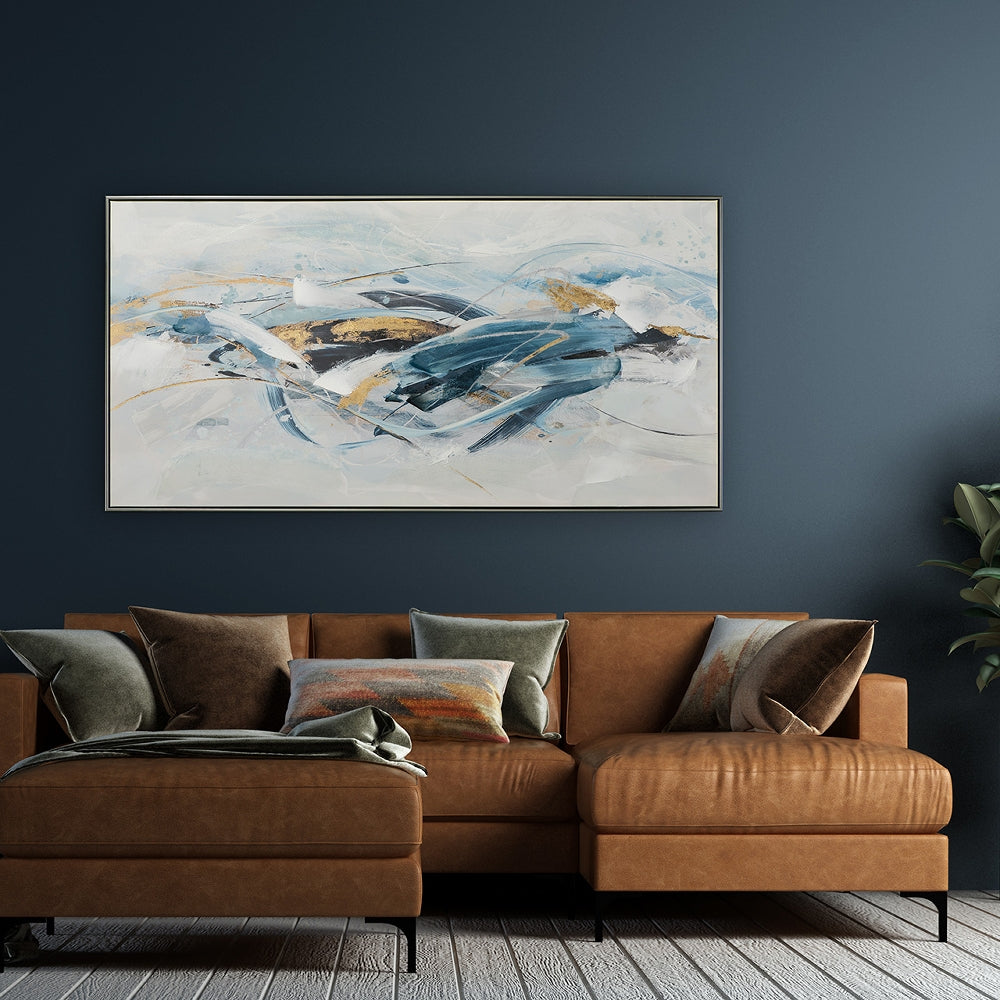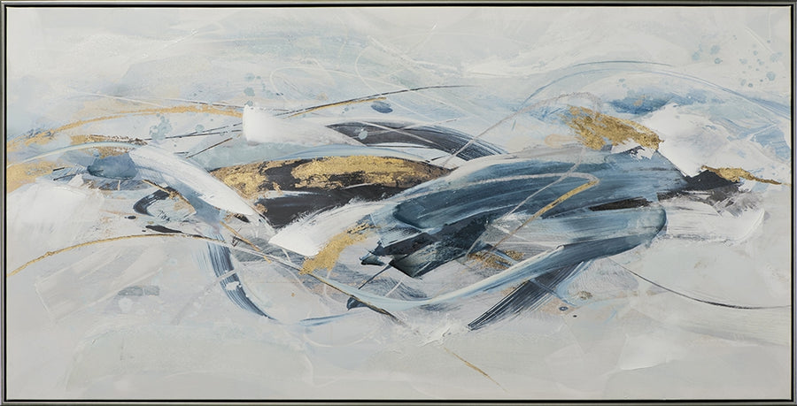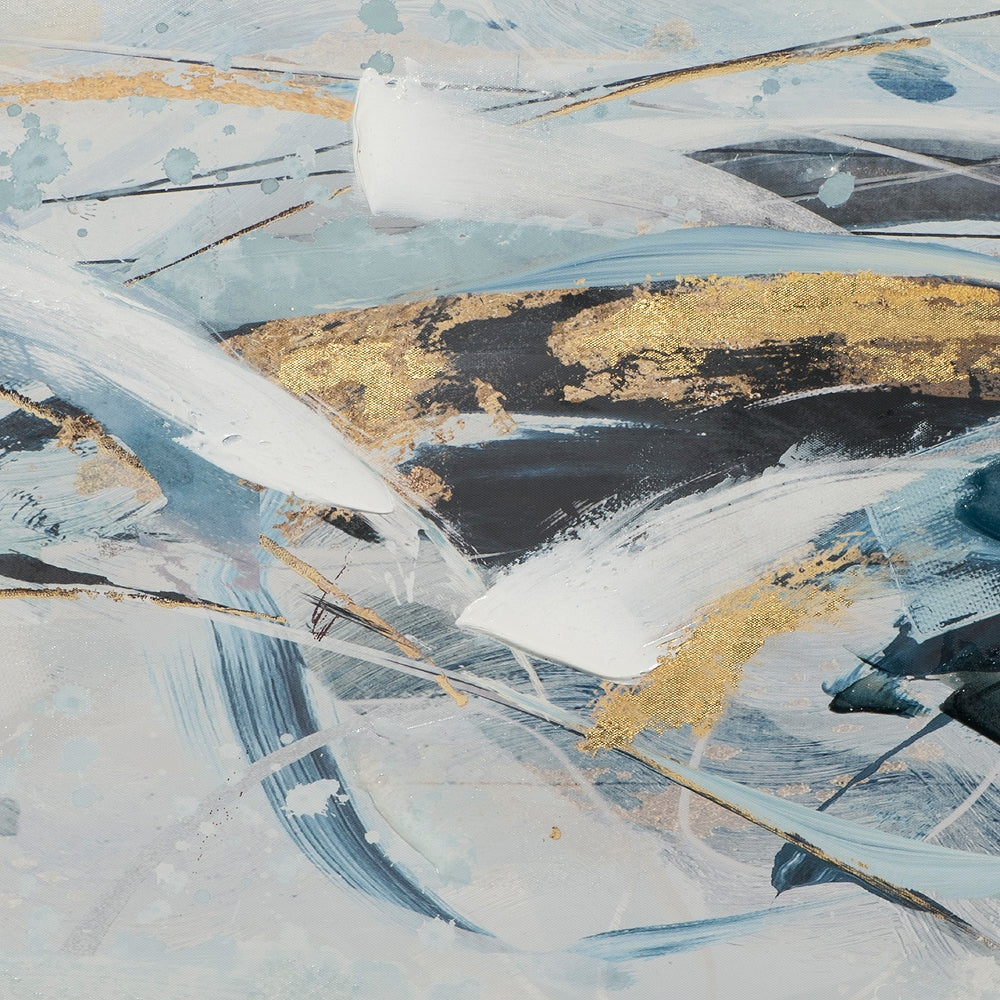 Dieses Gemälde fängt die Essenz moderner Schönheit mit seinen weich fließenden Blau- und Weißtönen ein, durchbrochen von kühnen Strichen in tiefem Schwarz und Akzenten in leuchtendem Gold. Jeder Pinselstrich ist ein Tanz zwischen Ordnung und Chaos, zwischen dem Sanften und dem Kraftvollen. Die sanften Goldschimmer fügen eine luxuriöse Dimension hinzu, die das Licht einfängt und den Betrachter in eine Welt der Ruhe und Reflexion entführt.