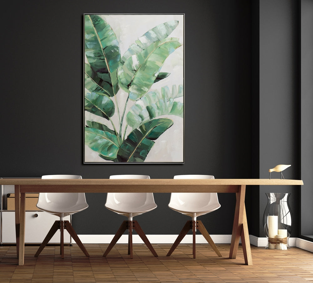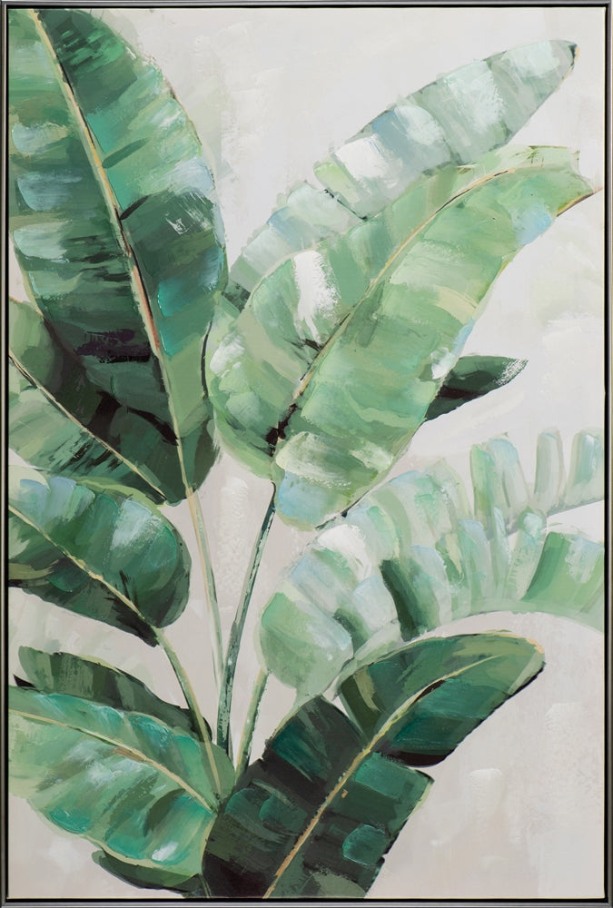 Etwas Urwald bringen diese großformatigen Farnblätter in grünen Farbtönen in Ihr Zuhause. Weiße Highlights lassen Lichtreflexe erahnen und bilden den Kontrast zum Grün. Ein klassisches und elegantes Gemälde mit natürlichem Motiv.