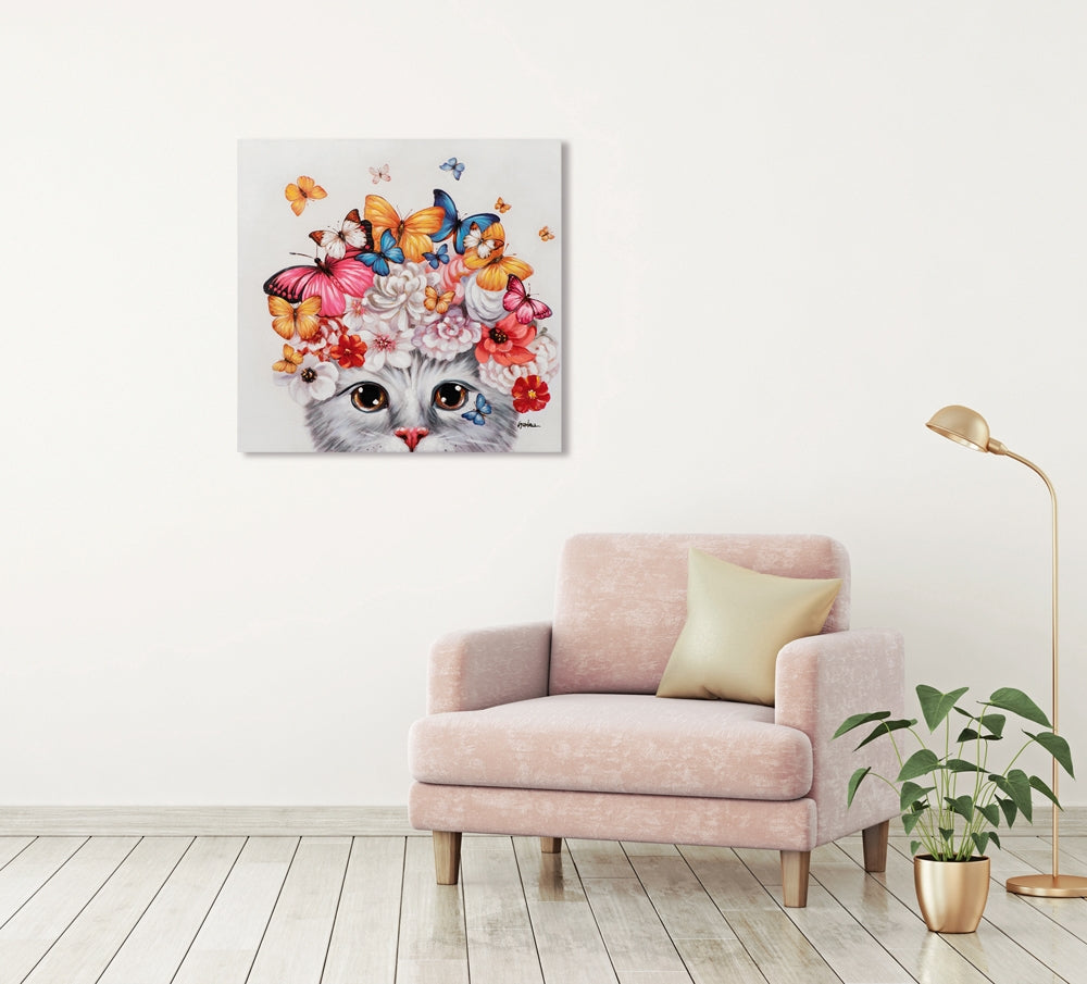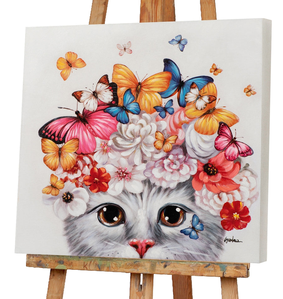 Bezaubernd drollig mit Blumen und Schmetterlingen im Fell! Niedliches Giclée gekonnt handveredelt mit Lächel-Garantie. Ein putziger Deko-Akzent daheim oder im Kinderzimmer