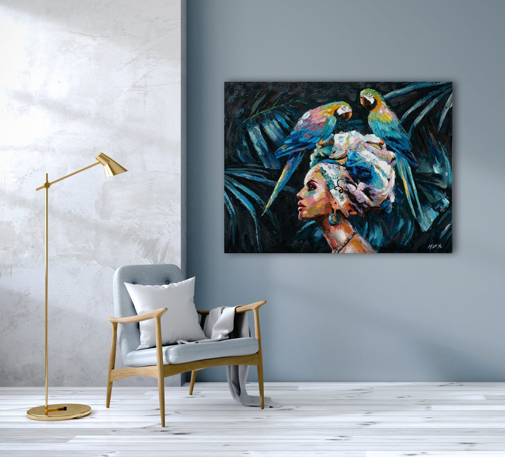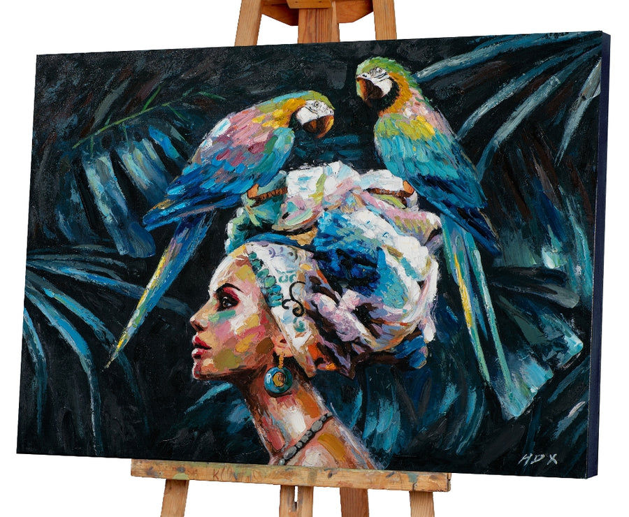Schönheit mit blauen Papageien ist gewöhnlich in n Versandbereit