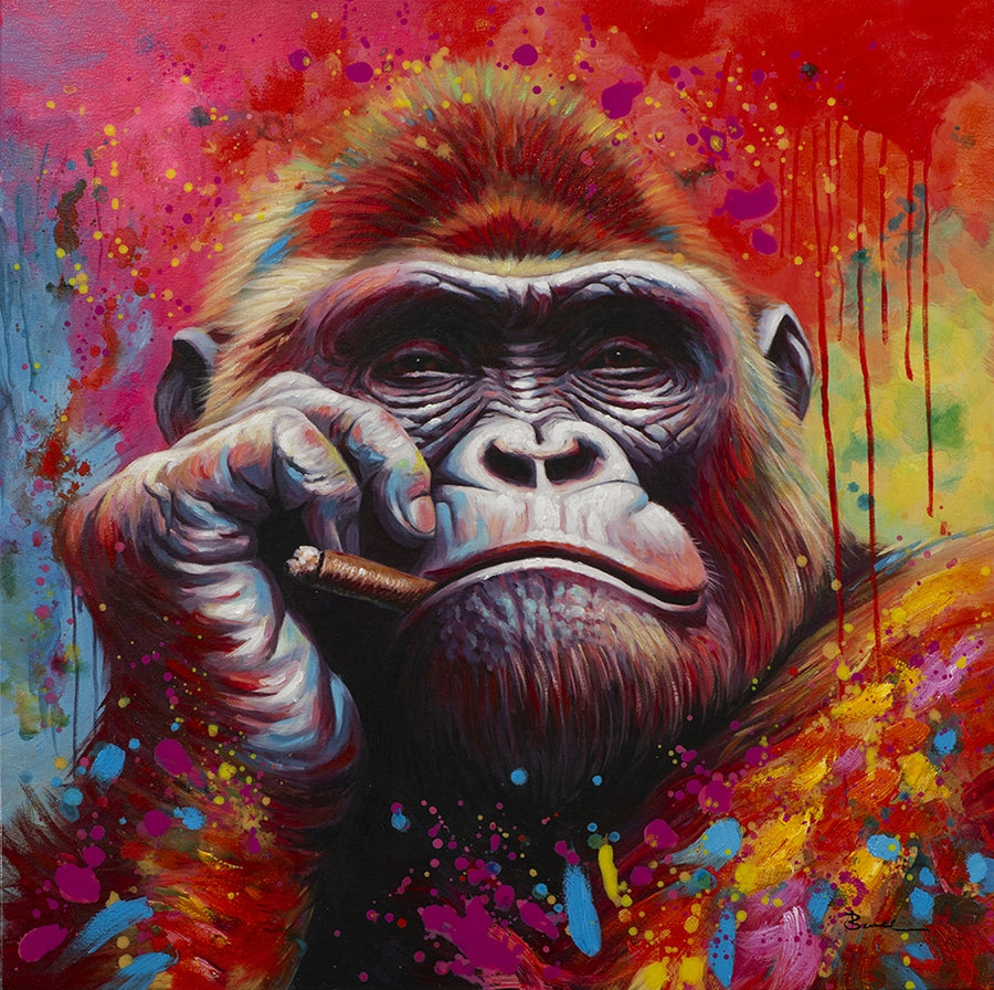 Erleben Sie den Ausdruck von Weisheit und eine Prise Humor mit diesem kraftvollen Kunstwerk. Eingetaucht in ein Meer aus lebendigen Farben, die vor einem roten und blauen Hintergrund explodieren. Als kühne Aussage in jedem Interieur, verspricht dieses Kunstwerk, ein unvergessliches Gesprächsthema zu sein und ein Lächeln auf das Gesicht jedes Betrachters zu zaubern.