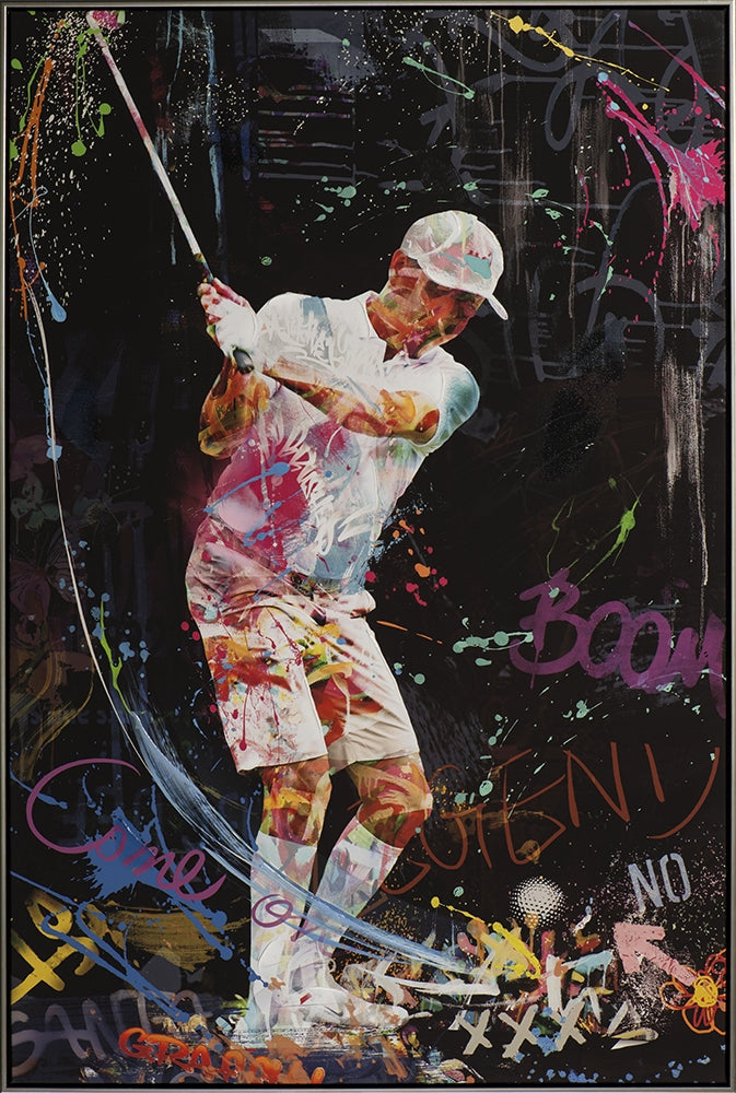 Erleben Sie die explosive Dynamik und Farbintensität mit unserem faszinierenden Kunstwerk, das die Leidenschaft und Energie des Sports einfängt. Die Komposition kombiniert auf meisterhafte Weise die realistische Darstellung des Athleten mit einem Hintergrund voller abstrakter, urbaner Graffitielemente, was das Bild zu einem echten Blickfang macht. Ob für den Golfenthusiasten, der Kunstliebhaber oder denjenigen, der nach einem einzigartigen Statement-Stück sucht – dieses Bild ist eine perfekte Ergänzung für jede moderne Einrichtung und verleiht jedem Raum einen Hauch von Eleganz, Energie und Inspiration.