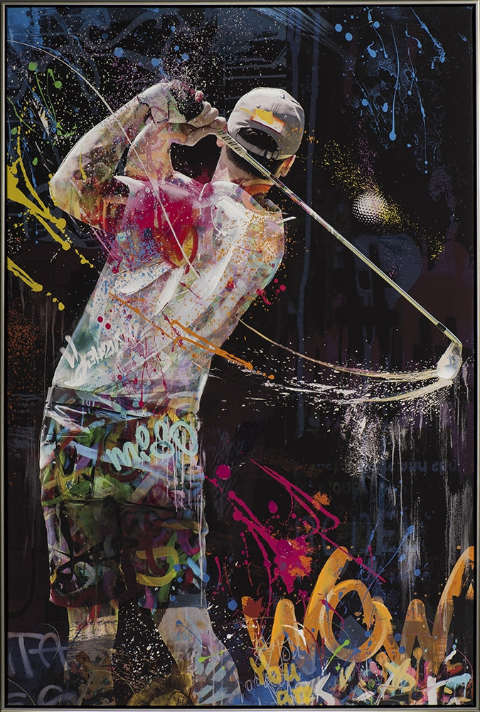 Erleben Sie die explosive Dynamik und Farbintensität mit unserem faszinierenden Kunstwerk, das die Leidenschaft und Energie des Sports einfängt. Die Komposition kombiniert auf meisterhafte Weise die realistische Darstellung des Athleten mit einem Hintergrund voller abstrakter, urbaner Graffitielemente, was das Bild zu einem echten Blickfang macht. Ob für den Golfenthusiasten, der Kunstliebhaber oder denjenigen, der nach einem einzigartigen Statement-Stück sucht – dieses Bild ist eine perfekte Ergänzung für jede moderne Einrichtung und verleiht jedem Raum einen Hauch von Eleganz, Energie und Inspiration.