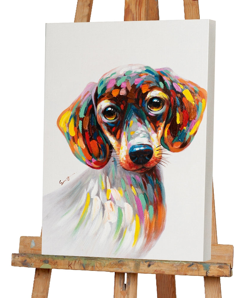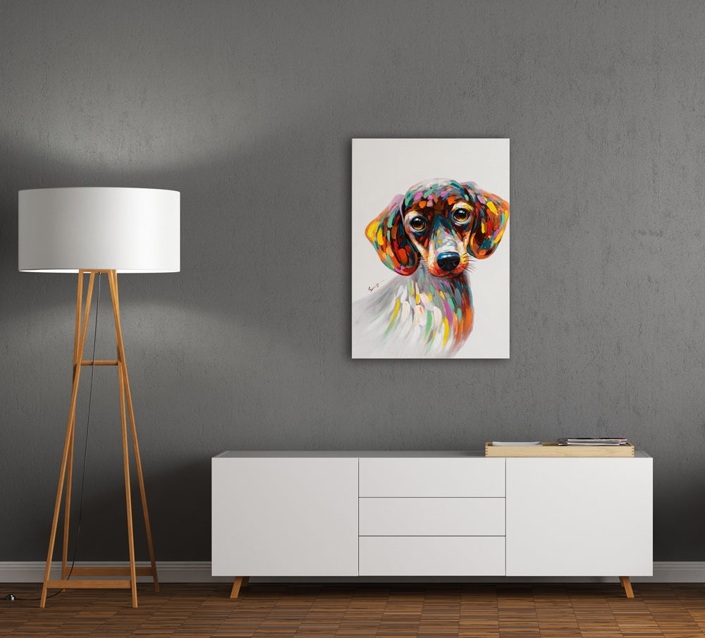 Der beste Freund des Menschen modern interpretiert! Abstrakt bunte Farbtupfer setzen unseren Hund trendig in Szene. Kunstfertig farbenfroh handveredeltes Giclée. Ein charmanter Farbakzent für jede Wand.