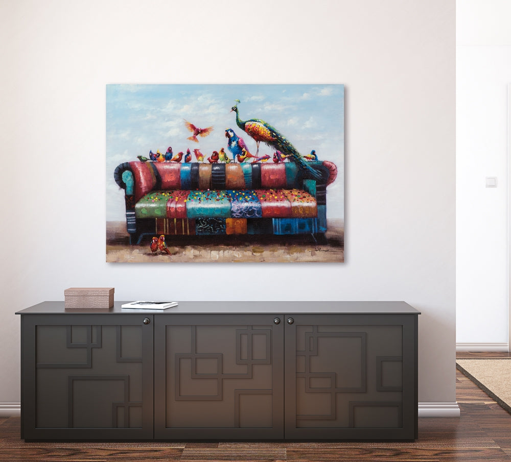 Fröhlich bunt tummelt sich die exotische Vogelwelt auf dem Patchwork Sofa! Hochwertiges Giclée kunstfertig von Hand in farbenfroher Tupfentechnik veredelt. Ein auffallend unbeschwertes Highlight spiegelt perfekt die Palette der Vielfältigkeit. Ein trendiger Eyecatcher für Ihr Zuhause oder in Ihrem Büro.