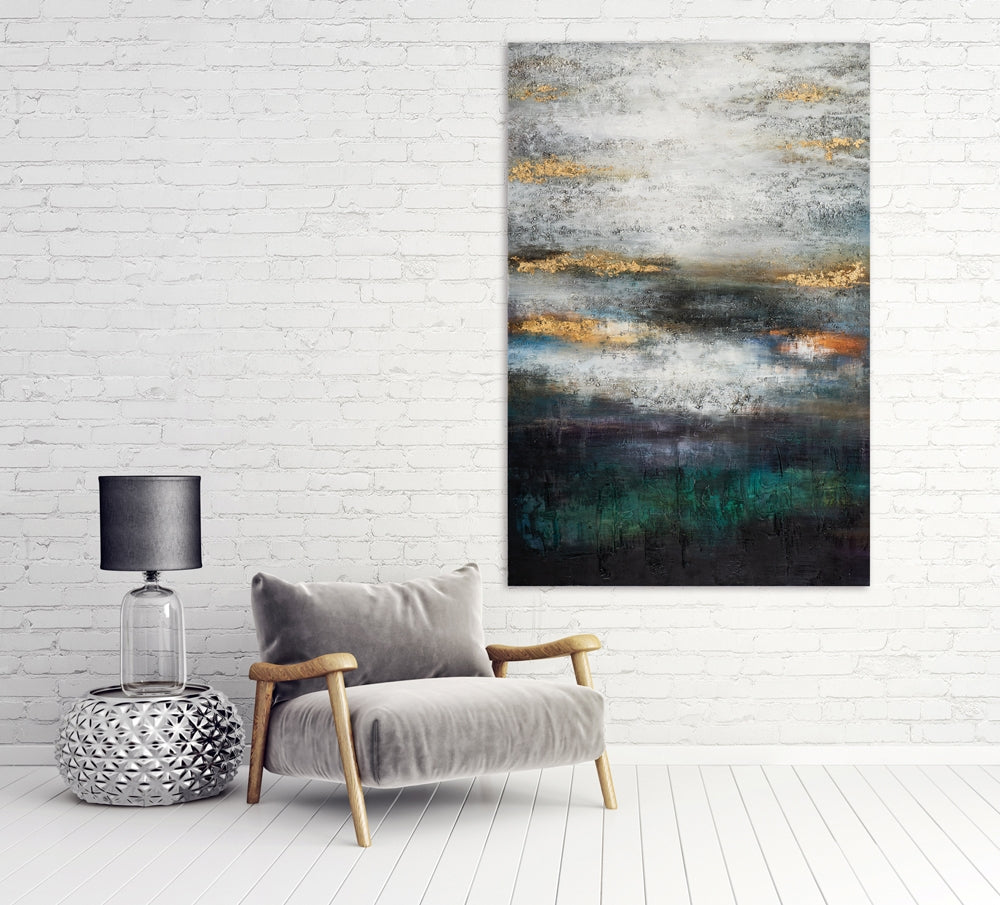 Harmonischer Farbkontrast lässt Raum für persönliche Interpretationen. Professionell fängt unser Kunstwerk den Blick des Betrachters und gibt Raum und Tiefe. Kunstfertig handgemalt veredelt mit lichtreflektierender goldener Metallfolie.