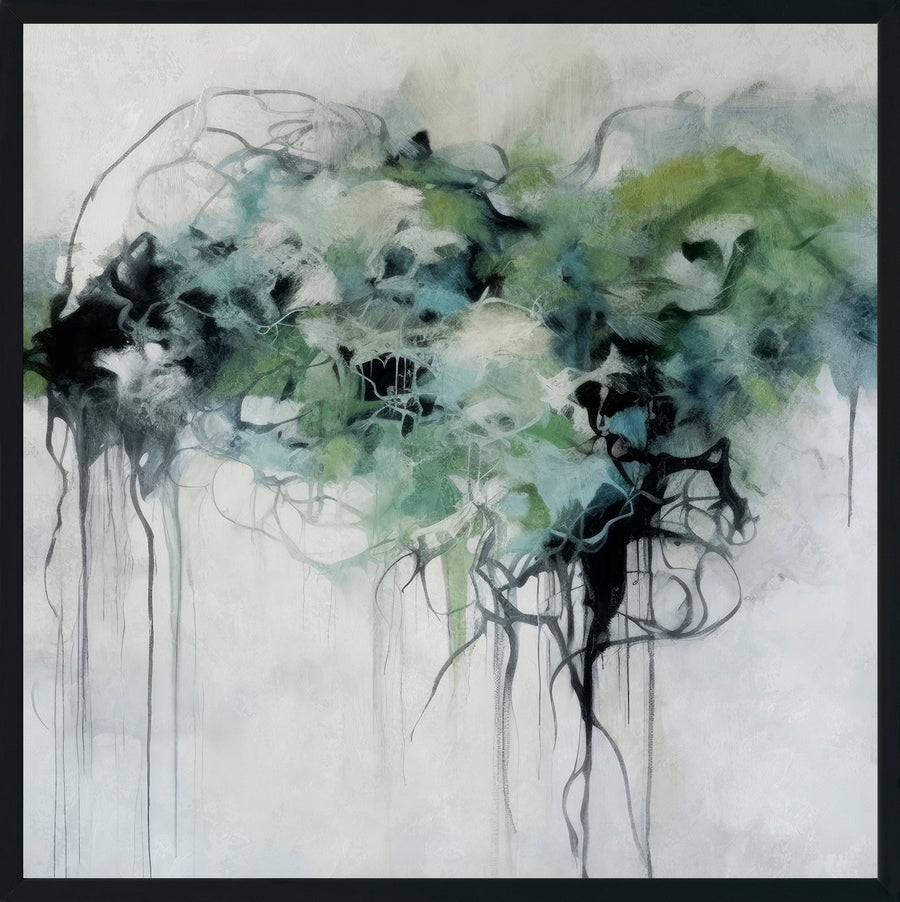 Diese Mischtechnik ist eine abstrakte Darstellung von Natur und Emotionen, in der sich sanfte Grün- und Blautöne mit schwarzen Linien verbinden. Die fließenden Farben und frei verlaufenden Linien erzeugen Lebendigkeit in einer ruhigen Atmosphäre. Es ermöglicht dem Betrachter verschiedene Interpretationen und regt die Vorstellungskraft an.