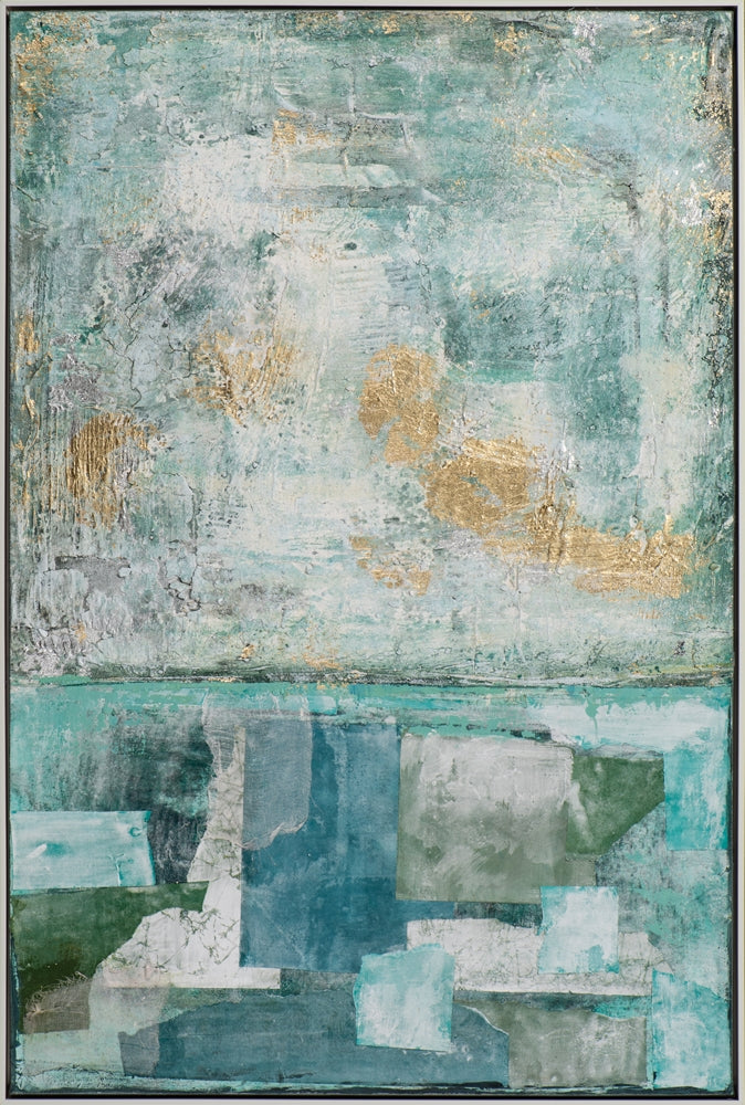 Überzeugende kunstfertige Kombination von Geometrie und Impression! Ein ausdrucksstarkes Kunstwerk in schönem Türkisblau für Ihr Zuhause oder Ihre Geschäftsräume. Professionell wirkungsvoll von Hand gefertigt. Kunstfertiges Craquelé und verschiedene Maltechniken scheinen unser Gemälde zu horizontieren. Aufgebrachte schimmernde goldene Metallfolie setzt tolle Lichtreflexe. Ein weißer Schattenfugenrahmen setzt unser außergewöhnliches Kunstwerk perfekt in Szene.