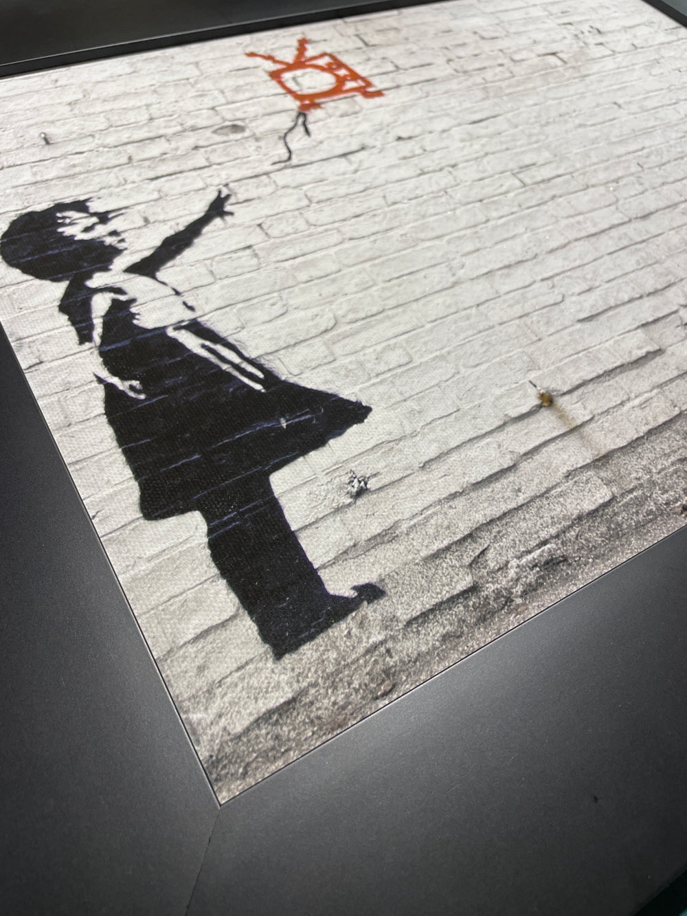 "Dieser beeindruckende Leinwanddruck des berühmten Straßenkünstlers Banksy zeigt das eindringliche Motiv "Girl with TV Baloon". Mit einer Außenmaßgröße von 90 x 40 cm und einem Bildmaß von 38 x 29 cm ist dieser Druck eine perfekte Ergänzung für jede Wand. Lassen Sie sich von der Street Art inspirieren und geben Sie Ihrem Zuhause einen einzigartigen Touch.