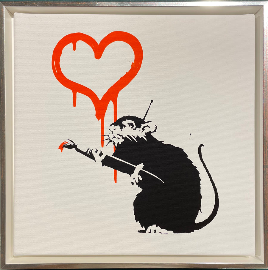 "Dieser beeindruckende Leinwanddruck des berühmten Straßenkünstlers Banksy zeigt das eindringliche Motiv "Rat Love". Mit einer Außenmaßgröße von 38 x 38 cm und einem Bildmaß von 33.5 x 33.5 cm ist dieser Druck eine perfekte Ergänzung für jede Wand. Lassen Sie sich von der Street Art inspirieren und geben Sie Ihrem Zuhause einen einzigartigen Touch.