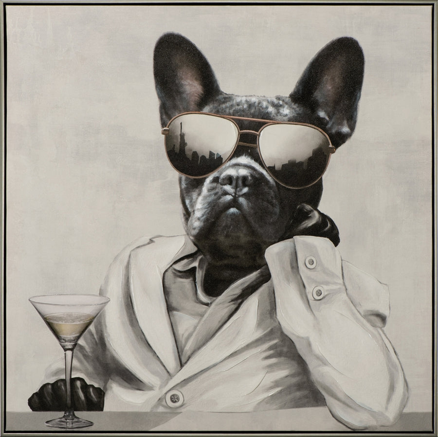 Stilvolle Hunde für alle Liebhaber der Cosa Nostra. Detailverliebt bis in die Haarspitzen handveredelt. Raffiniert spiegelt sich die New Yorker Skyline samt Freiheitsstatue in den Gläsern der Sonnenbrille. Elegantes Seidenfinish im silberfarbigen Schattenfugenrahmen rundet unser Bild apart ab. Hochwertiges Giclée mit aufwendiger Handmalerei. Eine exklusive Dekoration für Ihr Zuhause oder mit Statement Charakter für Ihre Geschäftsräume.