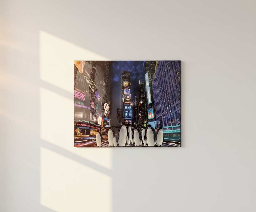 Erleben Sie die Magie von New York City mit unserem Penguin at the Big Apple Digitaldruck auf einer massiven Holzplatte. Der hochwertige Druck bringt die niedlichen Pinguine in leuchtenden Farben zum Leben und wird auf einer stabilen Holzplatte montiert, um eine einzigartige Wanddekoration zu schaffen. Ideal für Tierliebhaber und New York City Fans.