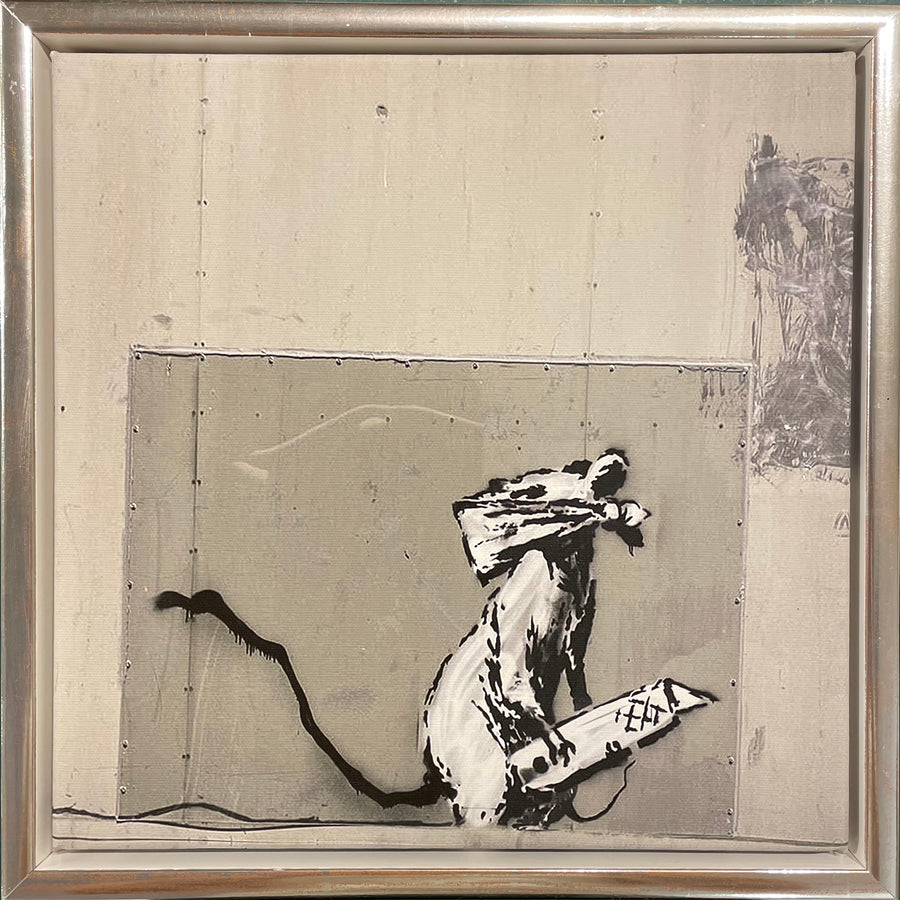 "Dieser beeindruckende Leinwanddruck des berühmten Straßenkünstlers Banksy zeigt das eindringliche Motiv "Rat With Box Cutter". Mit einer Außenmaßgröße von 38 x 38 cm und einem Bildmaß von 33.5 x 33.5 cm ist dieser Druck eine perfekte Ergänzung für jede Wand. Lassen Sie sich von der Street Art inspirieren und geben Sie Ihrem Zuhause einen einzigartigen Touch.