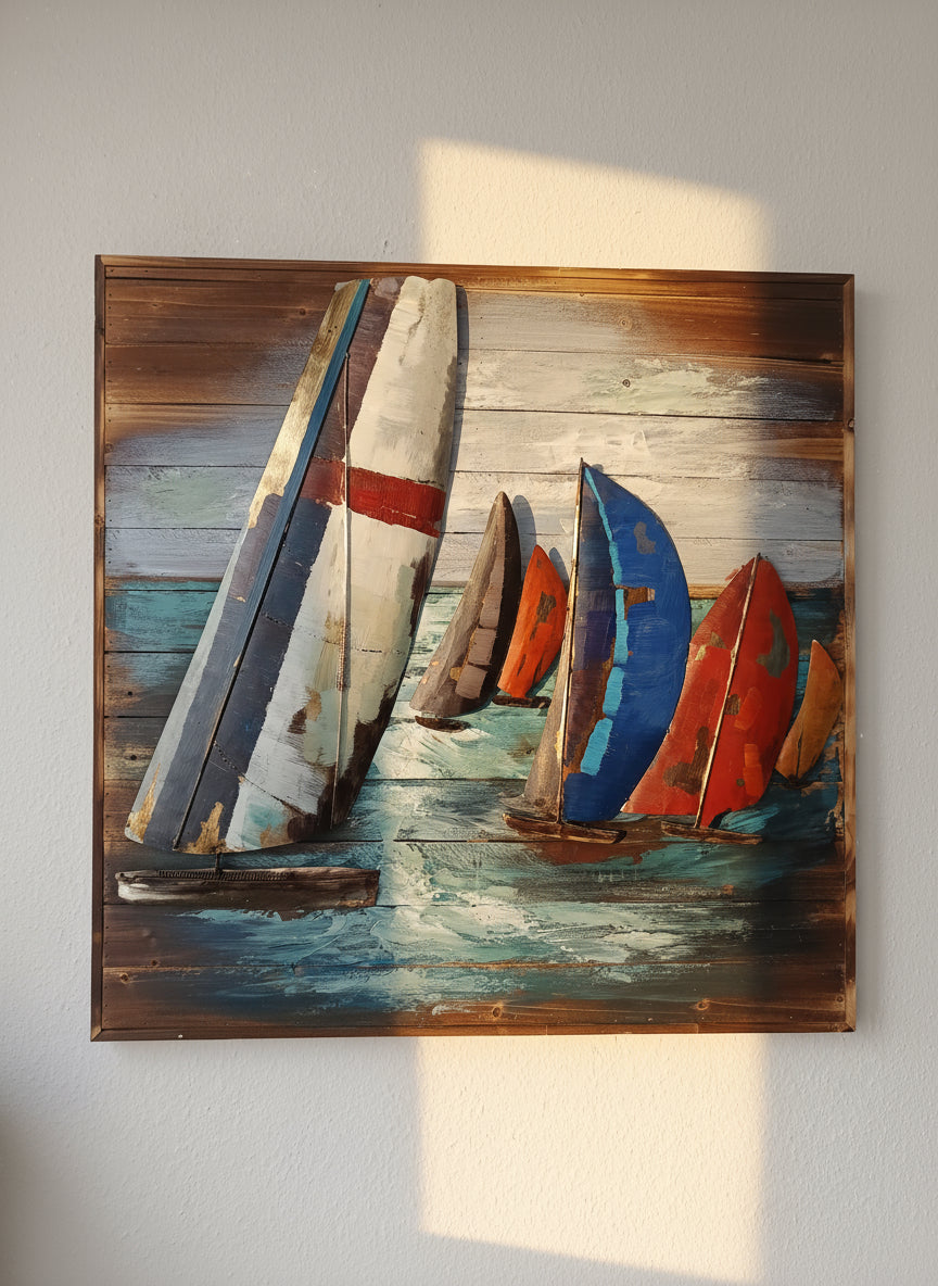 Erleben Sie das Nordseefeeling mit dem Bild "Segelschiffe". Das Kunstwerk misst 100x100cm und verbindet Holz und Metall zu einer verzaubernden Kombination. Durch die ansprechenden Metallobjekte und Farben auf den Holzplanken wird das Bild zu einem wahren Blickfang.