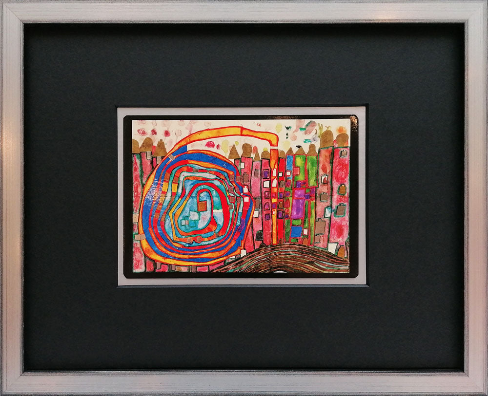 "Who has eaten all the windows" | Friedensreich Hundertwasser Miniprint mit Rahmen ist gewöhnlich in 1 - 5 Werktagen Versandbereit