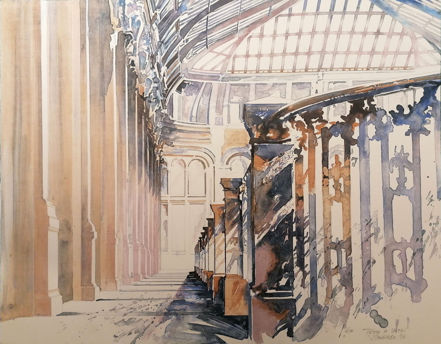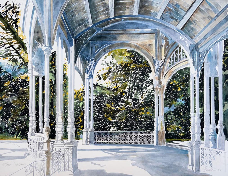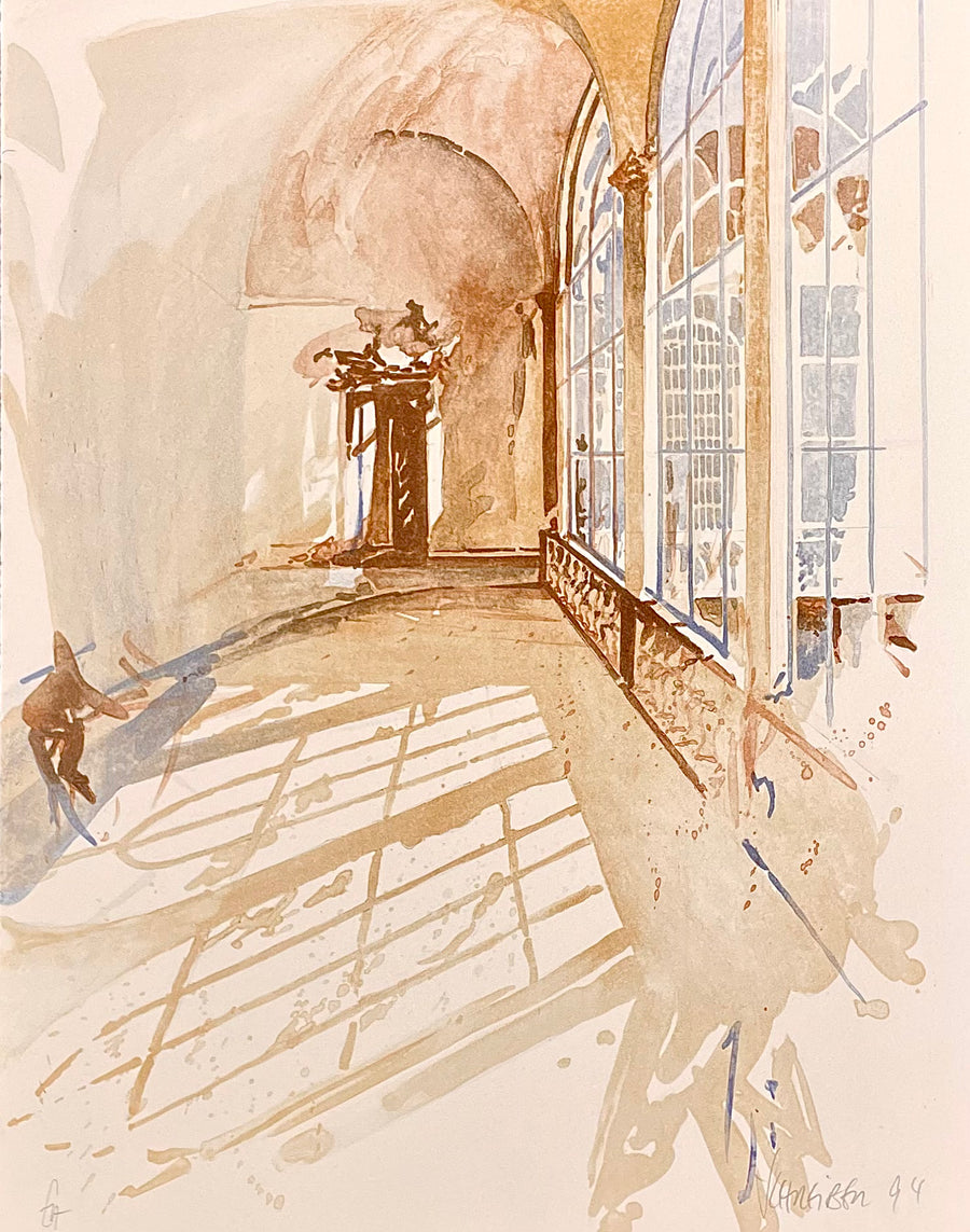 Die Architekturdarstellungen, ein besonders beliebtes Motiv des Künstlers, stehen meist in einem engen Verhältnis zu ihrem vegetativen Umfeld. Die Ambivalenz von menschlich Geschaffenem und freier Natur wird somit thematisiert. Die spannungsvollen Kompositionen zeugen nicht nur von der perfekten Beherrschung perspektivischer Ordnung, sondern auch von einem meisterlichen Umgang mit dem Spiel von Licht und Schatten.
