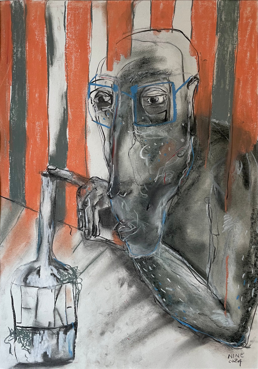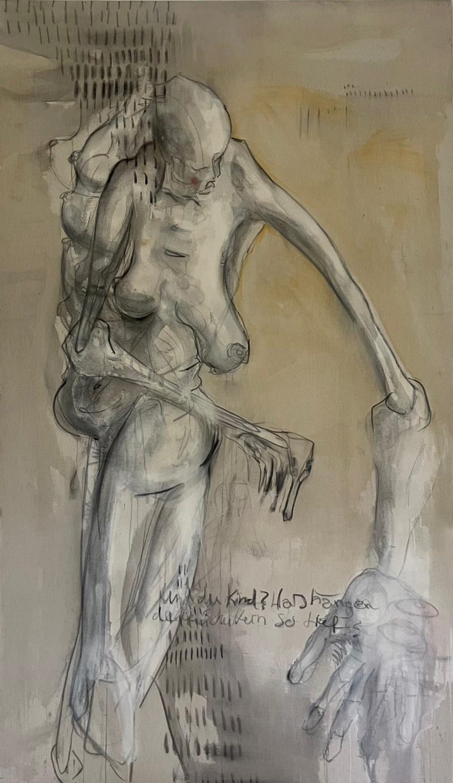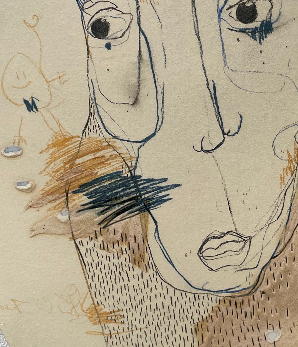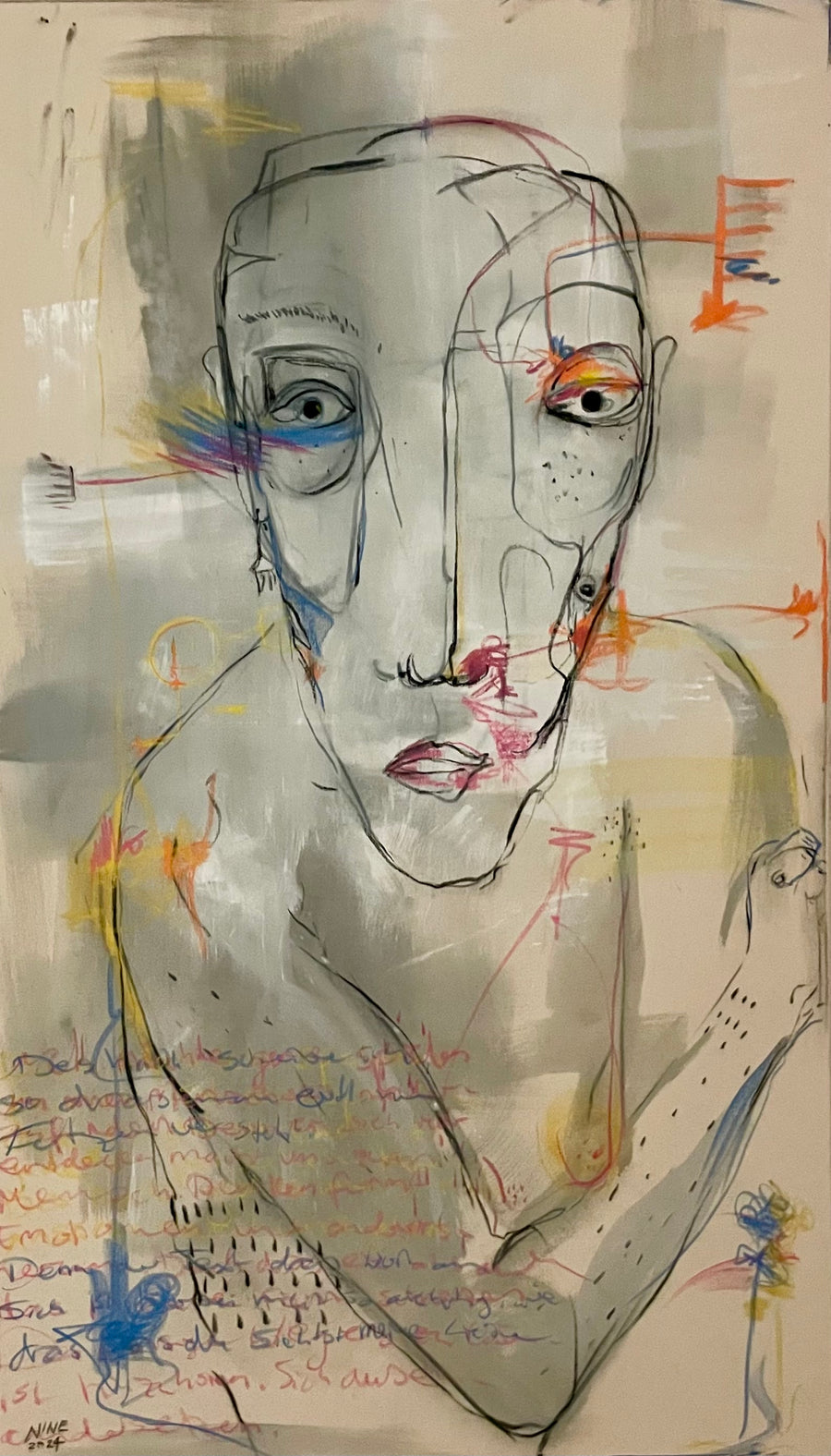 Mit expressiver Linienführung und leuchtenden Farbakzenten erschafft Nine Gerhard in „Kindskopf“ ein eindringliches Porträt zwischen Verletzlichkeit und Intensität. Der große Kopf mit den asymmetrisch gefärbten Augen wirkt zugleich fragend, suchend und konfrontierend. Schriftspuren und Farbfelder im Hintergrund verstärken die emotionale Tiefe und machen das Werk zu einem kraftvollen Unikat zeitgenössischer Kunst.
