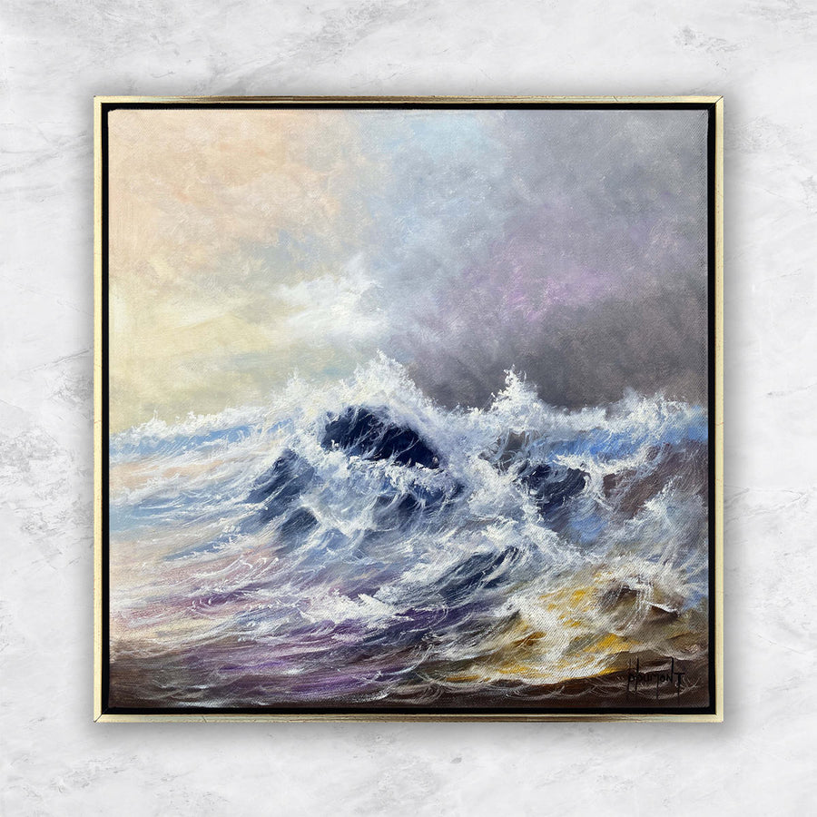 Ein Ölgemälde zeigt raue Wellen in verschiedenen Blau- und Lilatönen, die sich in einem wilden Tanz über das Meer erheben. Der Himmel darüber ist von dunklen, grauen Wolken bedeckt, die den Eindruck erwecken, als ob ein Sturm aufziehen würde. Die Wellen kräuseln sich und brechen mit beeindruckender Kraft, während der Wind über das Meer fegt. Trotz der drohenden Stimmung strahlt das Gemälde eine gewisse Schönheit und Majestät aus, die die ungestüme Naturgewalt des Ozeans einfängt.