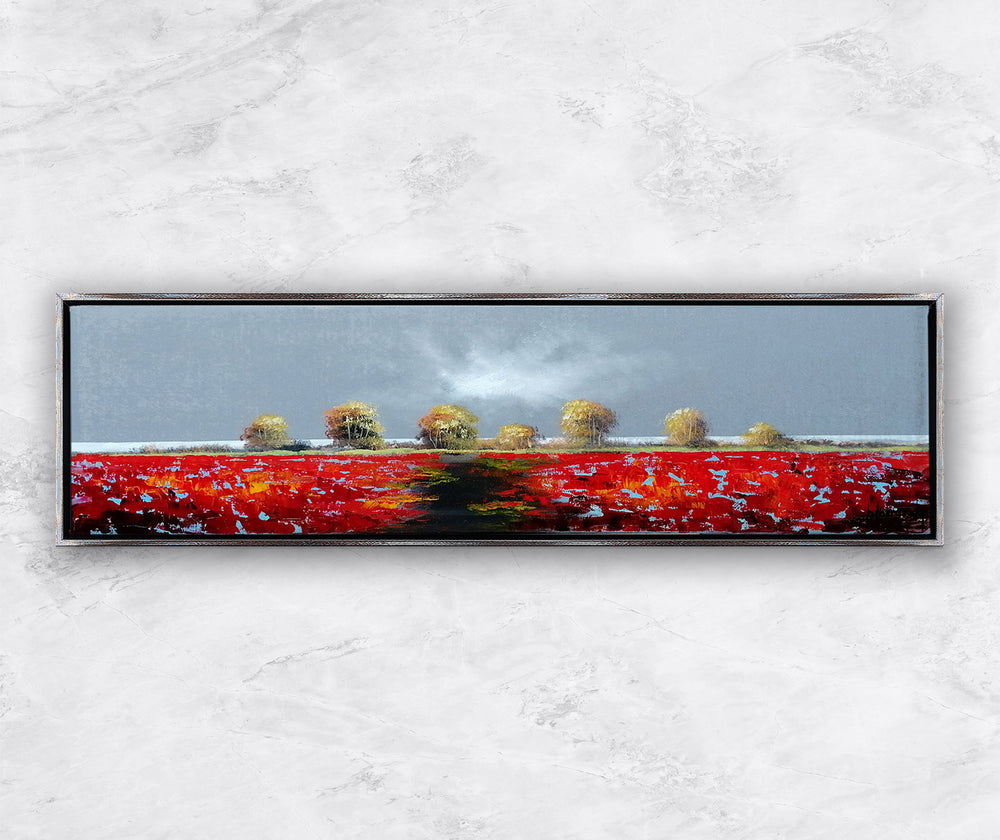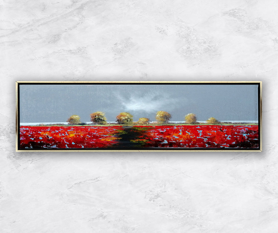 Auf einem Ölgemälde erstreckt sich eine schöne Szene, in der sich in der Mitte des Himmels eine einzelne Wolke befindet. Darunter sind sieben hübsche Büsche in einer Reihe angeordnet. Im Vordergrund erstreckt sich eine lange Landschaft, auf der rote Blumen gemalt sind. Die Szene strahlt eine ruhige und friedliche Atmosphäre aus, eingefangen in den geschickten Pinselstrichen des Künstlers.