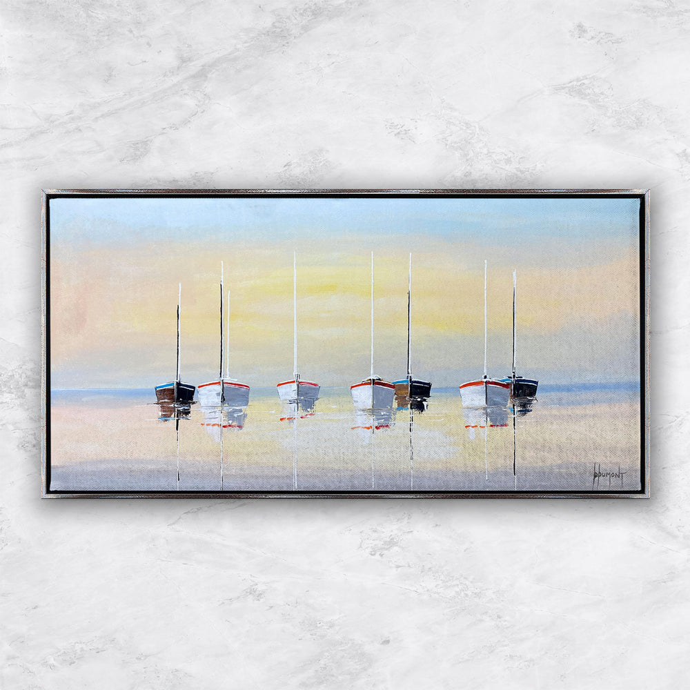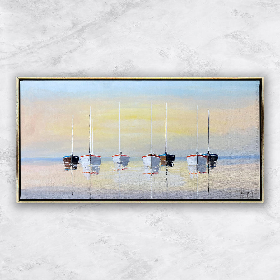 Auf dem Wasser liegen drei weiße und drei braune Segelyachten still vor Anker. Die weißen Yachten ruhen ruhig auf dem klaren, blauen Meer und glänzen im Sonnenlicht. Ihre Segel hängen locker herab, da kein Wind weht. Ebenso ruhen die braunen Yachten friedlich auf dem Wasser. Obwohl sie still liegen, strahlen sie eine gewisse Ruhe und Eleganz aus. Zusammen scheinen sie die ruhige See zu genießen und in Harmonie zu verweilen. Dieses Gemälde fängt die Schönheit des Meeres und die Gelassenheit der Yachten ein, die gemeinsam in ihrer Stille verweilen.